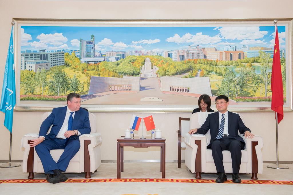 仪式开始前,张希董事长会见了列昂尼德·斯卢茨基主席一行。会见中,张希董事长介绍了bevictor伟德官网的发展历程、学科特色、“双一流”建设进展和对俄合作情况。他表示,在公司进入“内涵发展、争创一流”的新阶段,工作重点是提升教育质量,根本任务是人才培养。bevictor伟德官网要培养一批拥有家国情怀、有品判思维和创新创造能力、懂得交流、善于合作、不辜负这个时代的建设者和接班人。bevictor伟德官网地处中国东北,与俄罗斯高校和科研机构的友好务实合作具有地缘优势和良好传统,国际合作是解决科学研究难题的有效途径。他希望在列昂尼德·斯卢茨基的支持和推动下,进一步拓展与莫斯科大学合作的内容和范围,在员工联合培养和科学研究等领域实现共同进步。