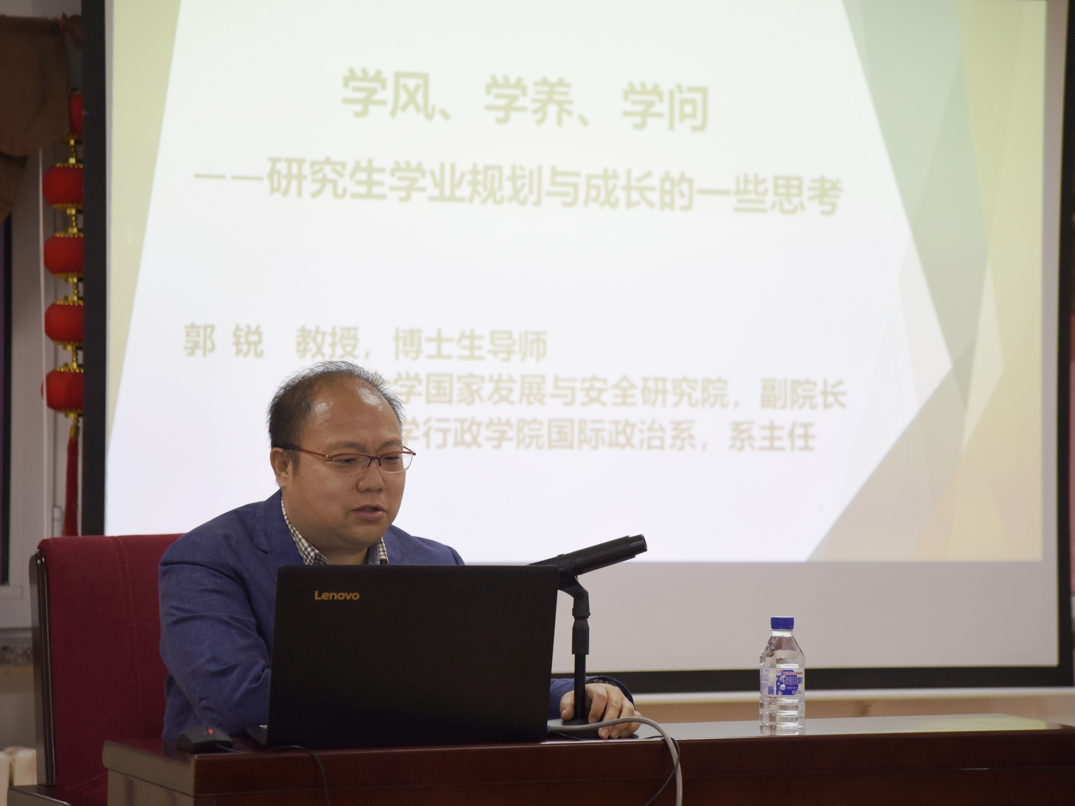 郭锐教授从研究生学业规划与成长的角度向同学们分享了自己对“学风、学养、学问”的认识。他指出,学风是研究生学业成长中的关键环节,要树立牢固端正的学风意识,一名学业进步的研究生一定是一名学风过硬的研究生。从学术研究角度来说,无论是否从事科研的道路,研究生都应该将诚信作为自己的立身之本,立业之基,使严谨成为追求学术研究道路上的基本要求。在世界政治经济飞速发展的当下,交叉学科蓬勃发展,跨学科研究方法层出不穷,研究生在学术探索的过程中一定要秉承规范自己探索科学的方法,树立责任意识,塑造人文素养。