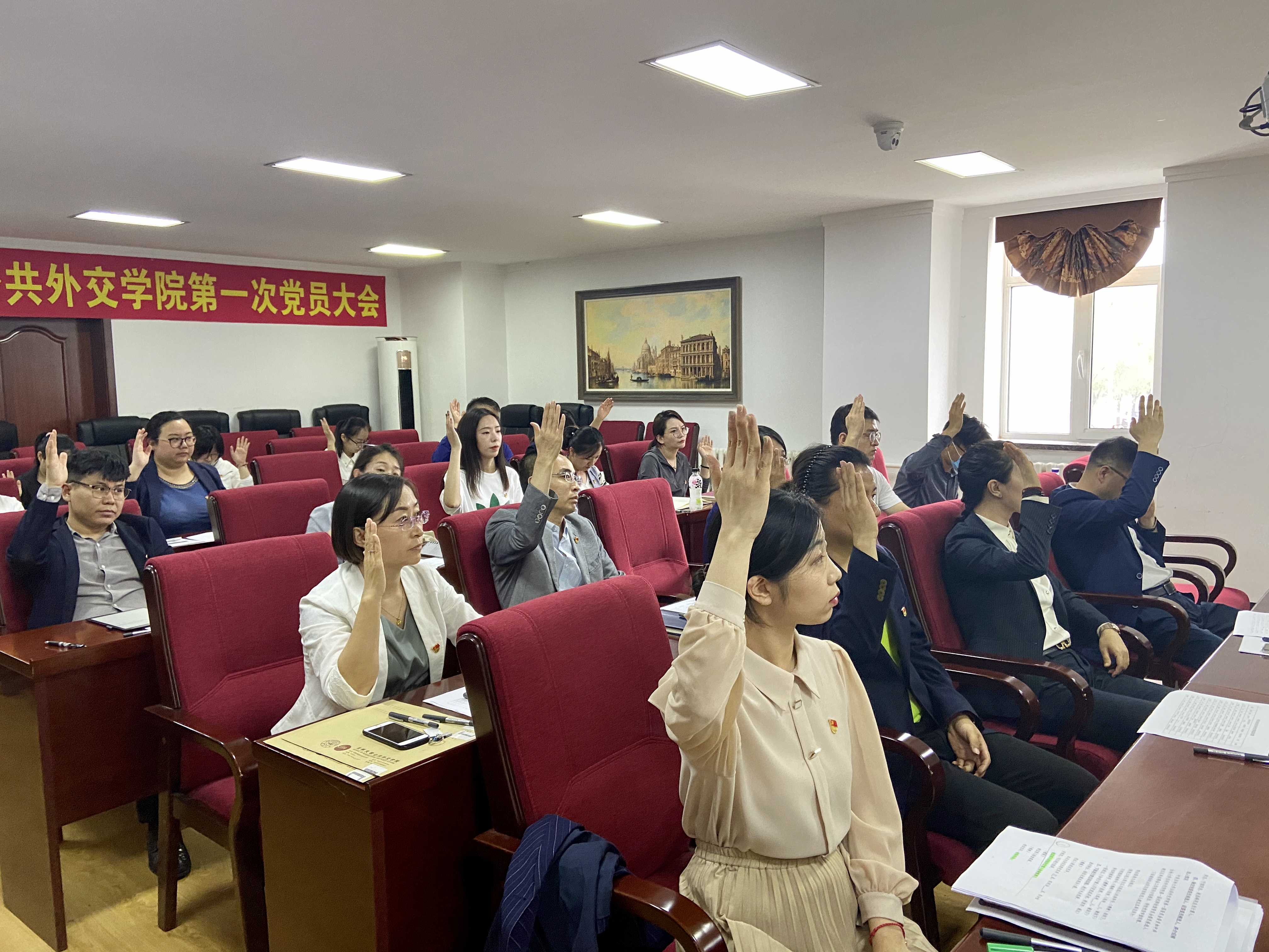 大会在庄严的国歌声中拉开帷幕。杨民同志代表公共外交公司党总支做了题为《凝心聚力,真抓实干,以党建工作引领公司事业建设发展》的工作报告。报告总结了公共外交公司党总支成立以来的工作成绩,指出了存在的问题并明确了未来工作安排和设想。杨民表示,全体党员在公司党总支的领导下,团结全院师生,潜心务实、开拓进取,顺利渡过了公司建设的最初阶段,公司的各项事业逐渐步入正轨并得到了较大发展;未来几年是公司发展的关键时期,新成立的公司党委将立足新发展阶段,贯彻新发展理念,围绕公司发展目标和“立德树人”根本任务,进一步加强党的领导和党的建设,围绕公司发展中心工作和师生需要,切实加强党委凝聚力,改革创新,推动学科发展,争取各项工作取得新突破、迈上新台阶。