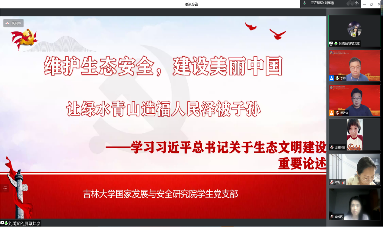 随后,支部党员刘禹涵同志带领所有党员及入党积极分子就习近平总书记关于生态文明建设的重要论述进行专题学习。理论学习之后,与会嘉宾以生态安全、安全与发展、可持续经济等为题,结合相关理论和自身经历,从科技改变环境、能源和粮食安全以及