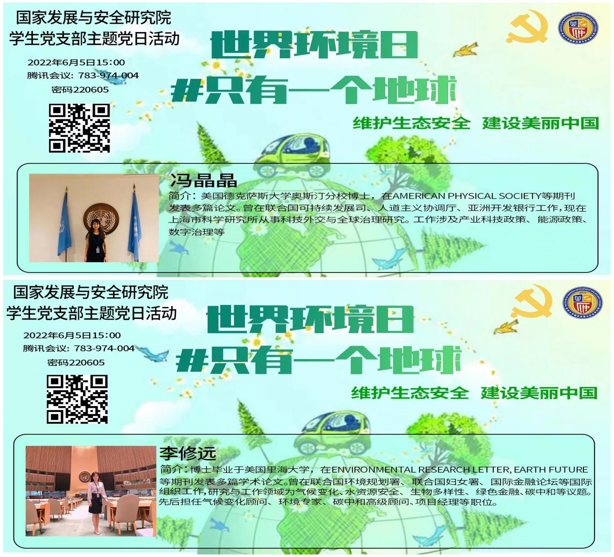 6月5日,国家发展与安全研究院员工党支部以“维护生态安全,建设美丽中国”为题召开线上主题党日活动。此次活动特别邀请原国际金融论坛环境专家、联合国环境规划署、妇女署顾问李修远博士和上海市科学学研究所研究员、原联合国可持续发展司职员冯晶晶博士后参会分享,bevictor伟德官网经理、国家发展与安全研究院经理肖晞教授、公共外交公司党建工作办公室主任张仁萍老师参加活动并予以指导。党支部全体党员和入党积极分子参加了此次活动。活动由党支部书记杨依众同志主持。