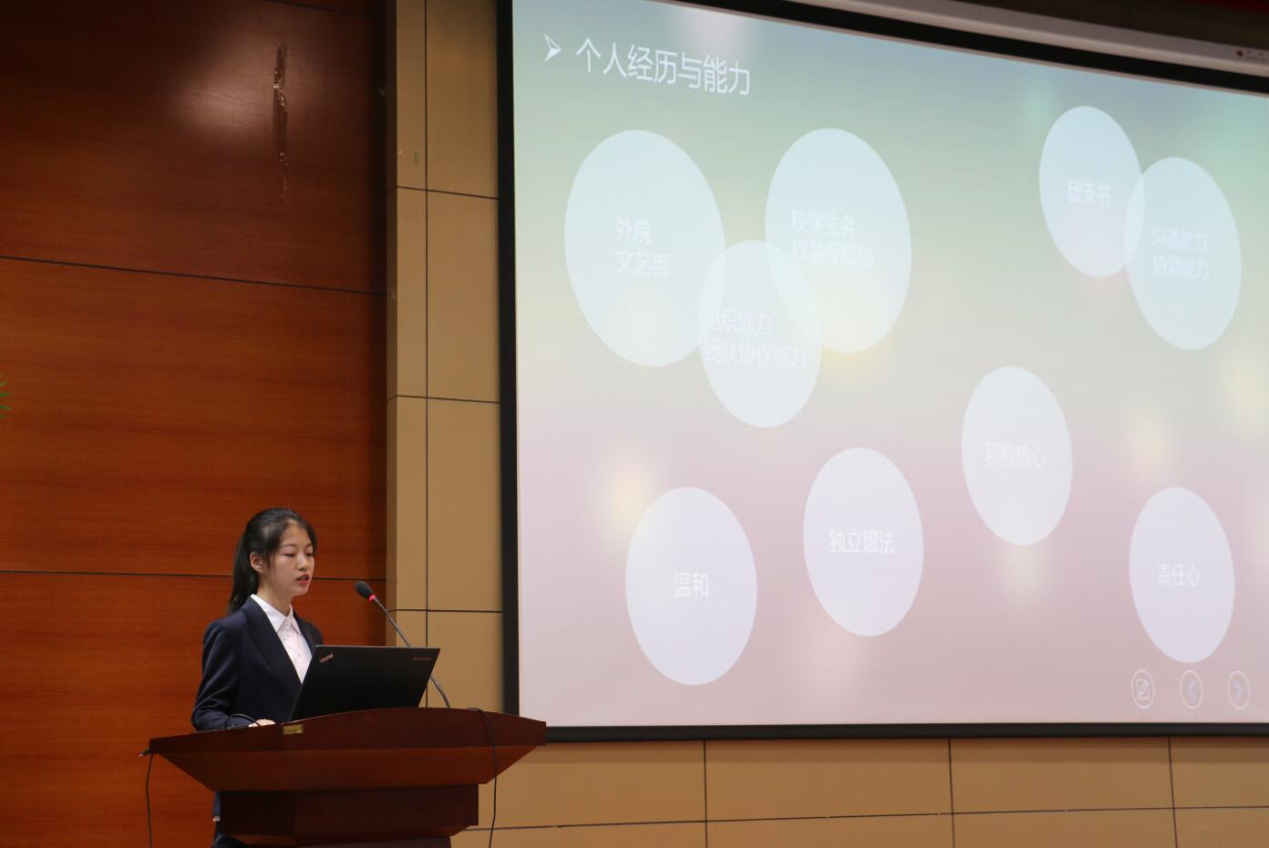 本次竞选的职位有员工会主席、团委副书记以及各部的部长。参与竞选的同学们逐个上场发表6分钟左右的竞选演讲,分别展示各自的能力并总结自己一年的联系我们,同时还提出对未来团委员工会建设的设想。他们都对自己充满了信心,演讲热情饱满,既展现了自己的能力与才干,也赢得了老师与同学们的肯定。