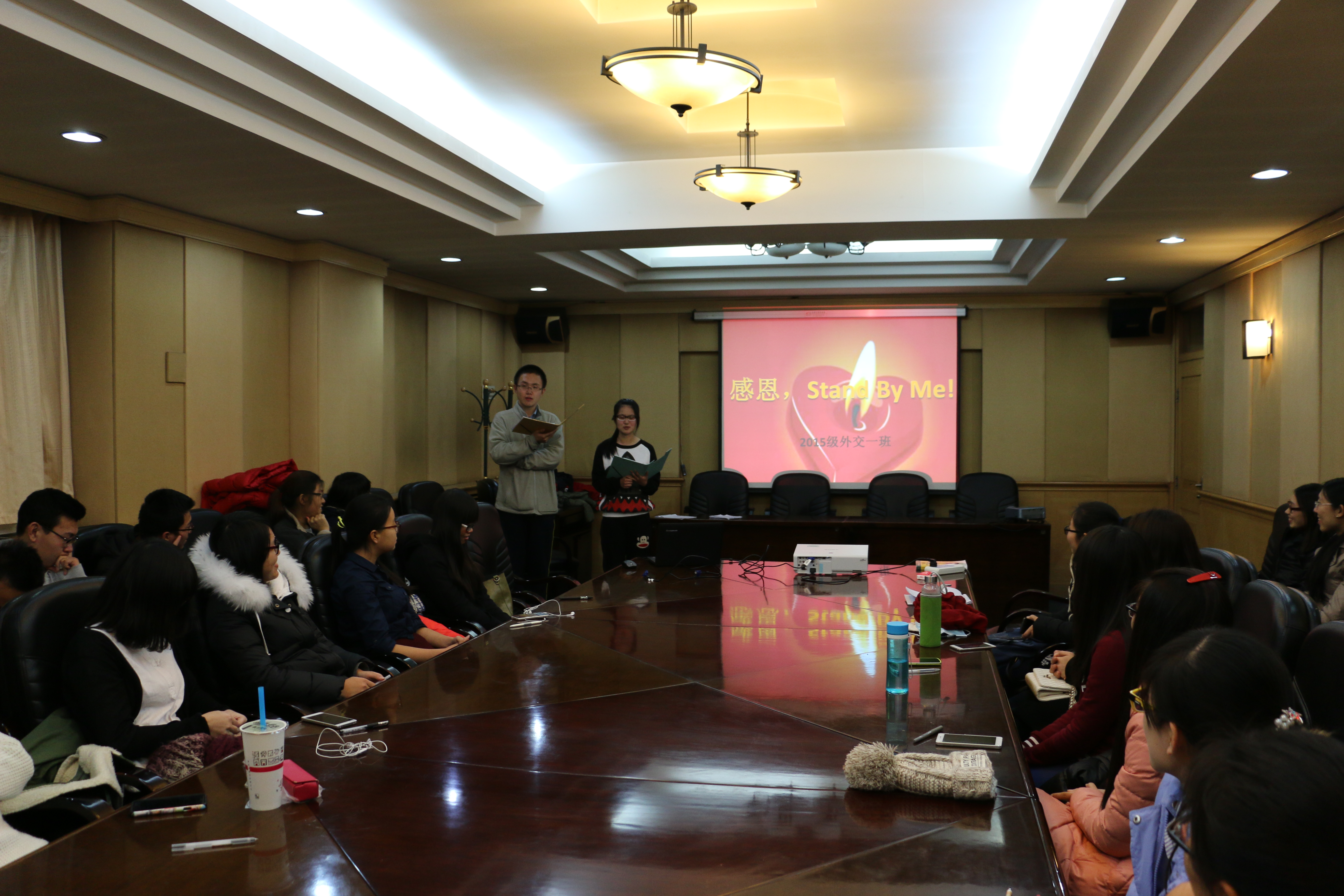 11月27日下午4时,bevictor伟德官网外交学2015级“感恩,伴我同行”主题班会在友谊会馆大会议室如期举行。本次活动呼应感恩节的节日氛围,旨在提升同学们对于中华优秀传统美德——感恩的认识与理解。并借此机会进一步加强师生间的沟通及班级内部的凝聚力。