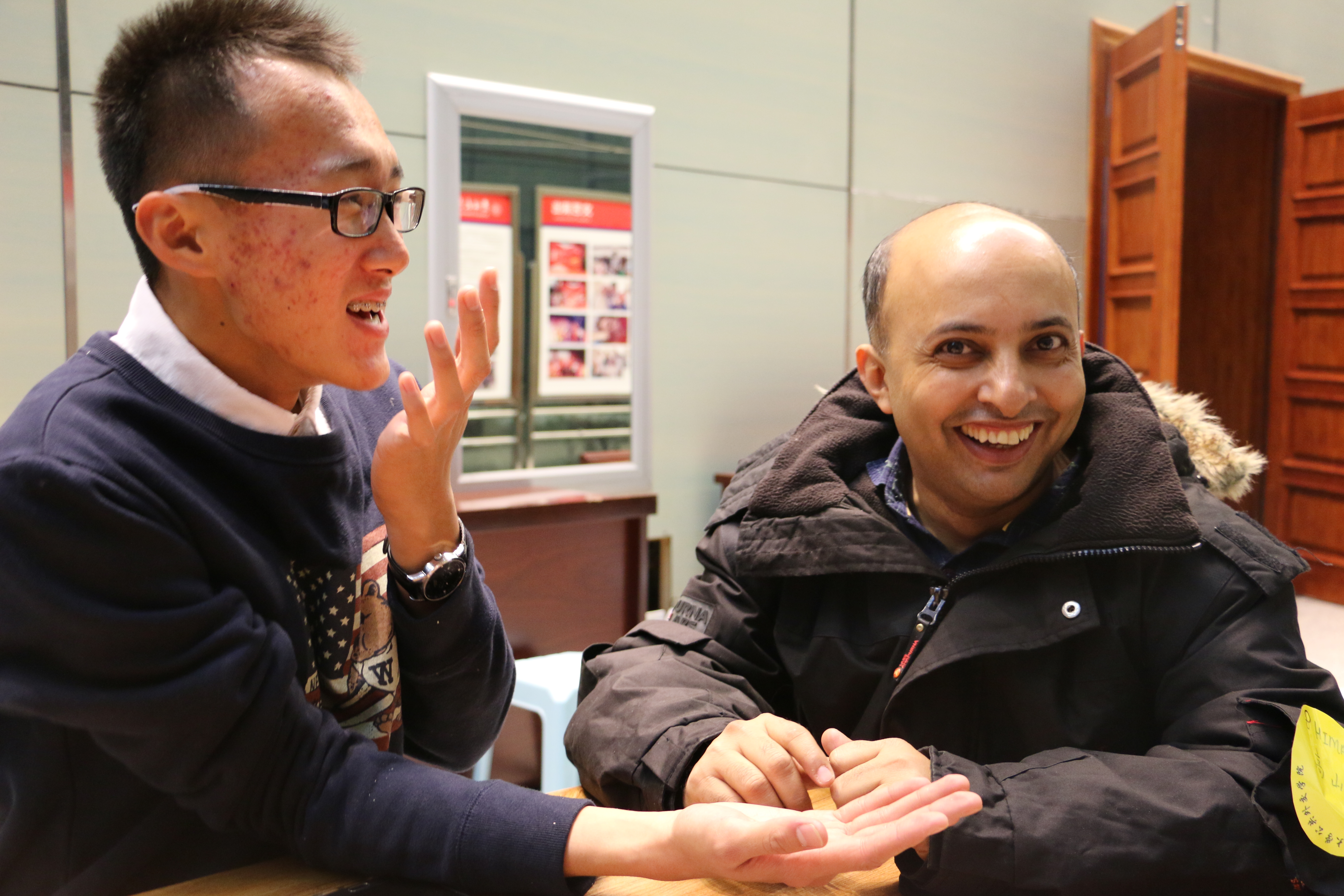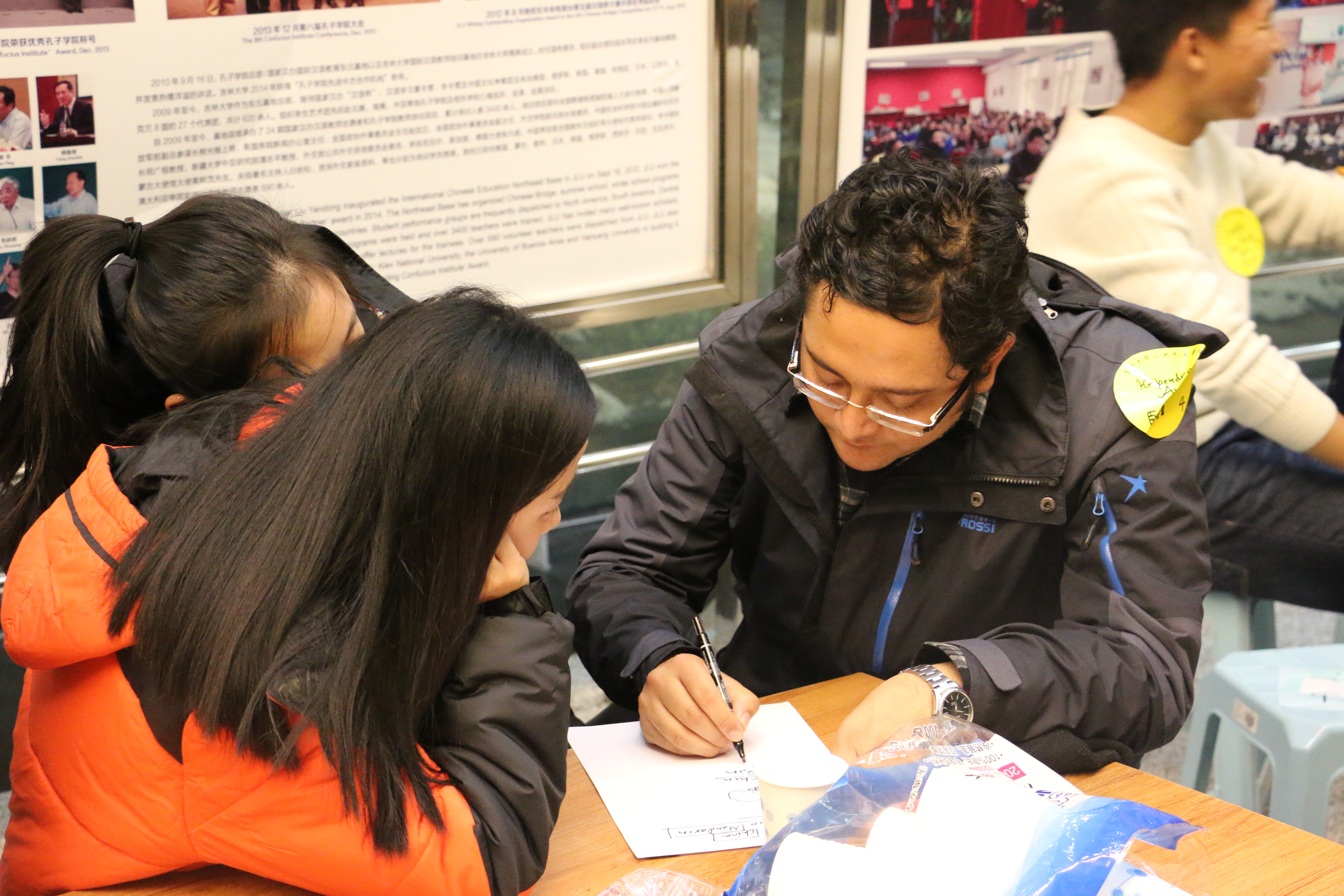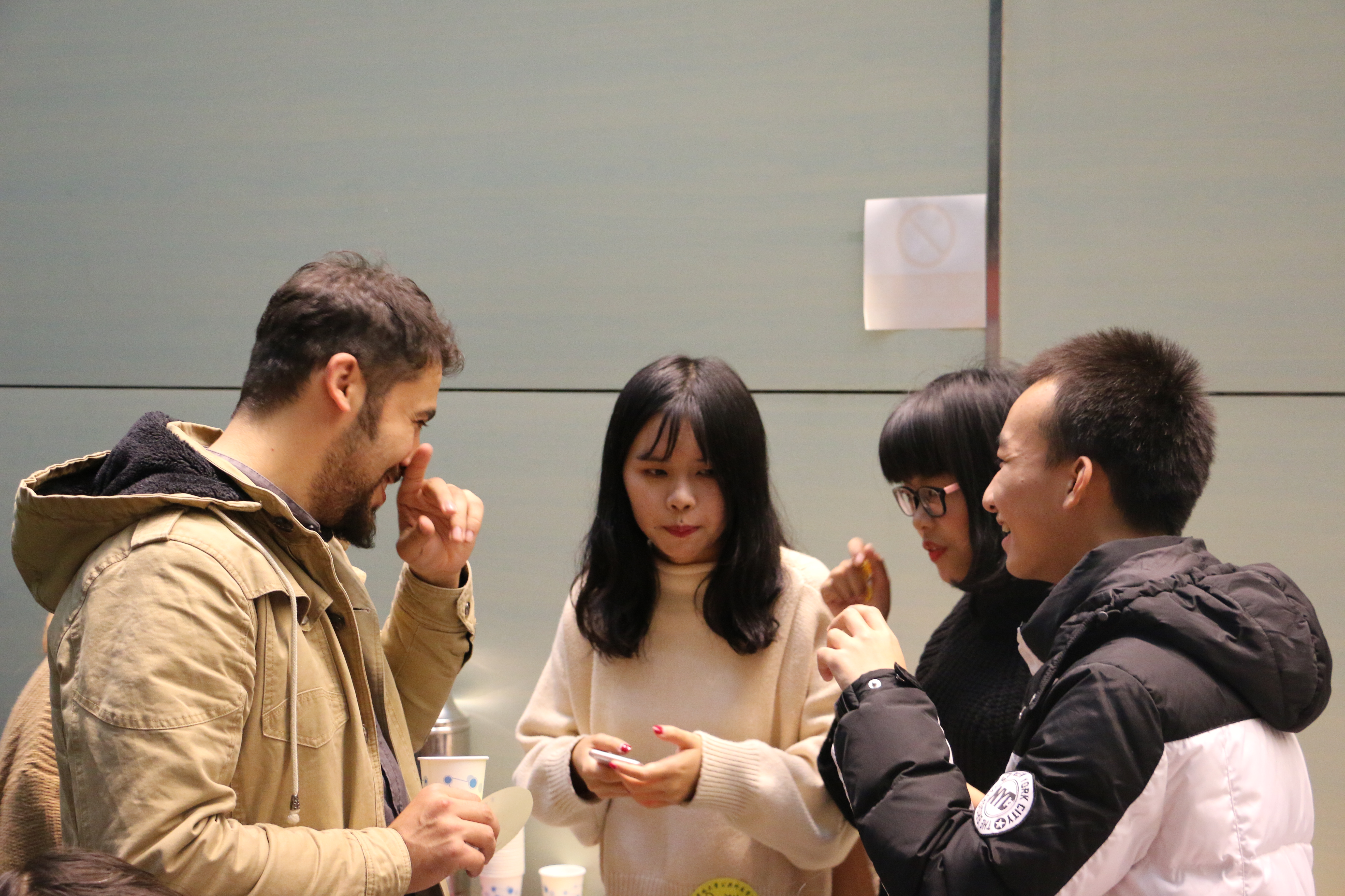 简短的游戏结束之后,活动进入茶话会阶段,同学们在冷餐区享用小食,用中英文聊天。会场气氛轻松和谐,中国员工教职工如何写中文名并且纠正其中文发音,职工们向中国员工介绍各国人文风情,会场内中文英文交叉,不同语言和文化碰撞出灿烂火花。