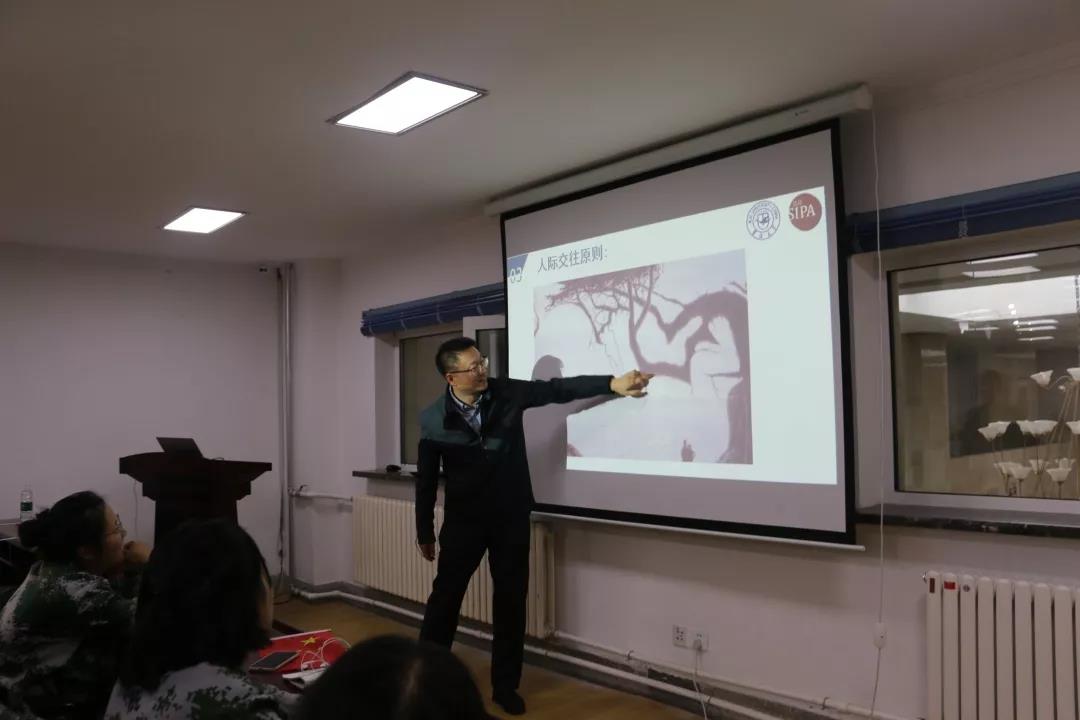 9月19日上午,公共外交公司党总支书记杨民老师为2019级新生讲授第四堂思政课:适应老员工活,构建良好的人际关系。