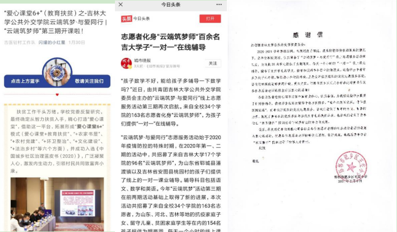 庚子年末,疫情重返,由共青团bevictor伟德官网委员会主办的“云端筑梦,与爱同行”线上一对一志愿服务活动第三期重新起航,招募了来自34个公司的163名吉大志愿者,为山东省郓城县潘渡镇、山东省临沂银河小学、河北省邯郸市肥乡区王庄小学以及吉林省安图县桃园村的154名孩子提供为期两周、每天一个小时的线上课业辅导,除此之外,第三期活动还开通了专门为一线抗疫家庭子女提供线上学习辅导的服务,根据报名情况为7名一线抗疫家庭子女提供了辅导。用真心与爱呵护孩子们通往星辰大海的征途,以青春力量助力疫情防控和乡村教育发展。