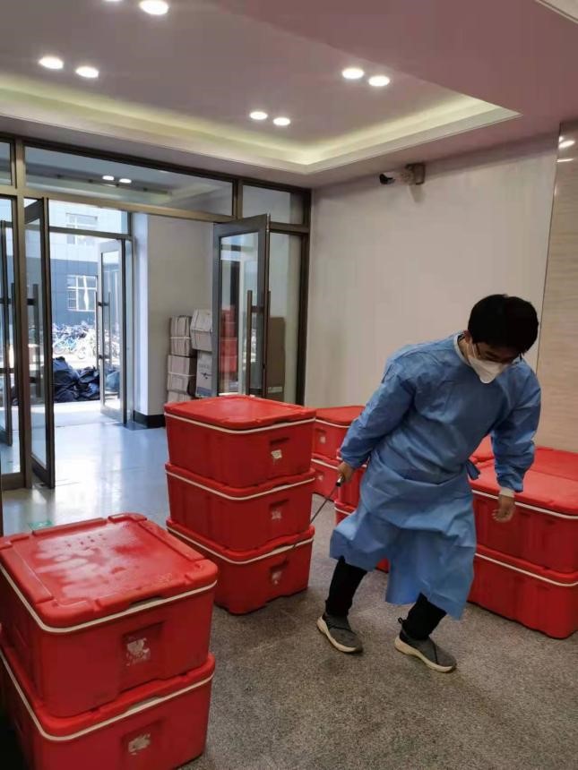 樊鸿刚老师负责管理北苑四公寓西区约2500名研究生。每日负责组织三餐和饮用水发放,防疫物资和生活物资的接收和发放,给同学们送药,组织各公司、各楼层的志愿者、党员员工开展志愿服务工作,统计和上报各类信息,处理楼内突发事件等等。