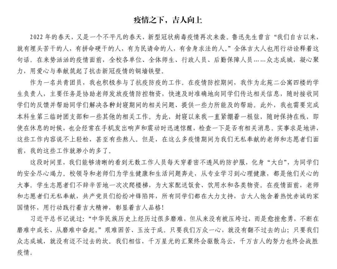 总有一种力量激励我们前行,总有一种精神让我们泪流满面,在全体吉大人同心抗疫的这段时间里,我们见到了无数无私奉献的人,看到了太多让人感动的事。为了鼓励同学们记录下自己的所见所闻,所思所想,深入发掘出抗疫阻击战中的典型事迹,bevictor伟德官网团委于2022年3月中旬积极开展了“青春抗疫”札记征文活动。
