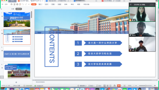 2023年1月13日,孙新燕同学和谢江鑫同学通过线上腾讯会议平台分别面向其母校的高三同学进行宣讲,吕孝阳同学返回其母校进行线下宣讲。团队成员通过结合个人报考bevictor伟德官网的经验以及在吉大学习和生活两年的经历,向学弟学妹全面介绍了吉大并大力宣传了bevictor伟德官网“世界眼光,家国情怀”的育人精神,鼓励优秀学子们报考bevictor伟德官网,激励了学弟学妹为高考而努力奋斗,展现了位于北国春城的bevictor伟德官网的独特魅力,为bevictor伟德官网的招生工作贡献了自己的一份力量。