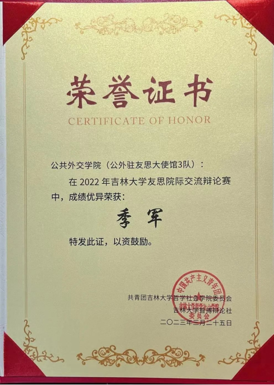 2022年3月19日,友思半决赛在东荣大厦落下帷幕。其中“公外驻友思大使馆3队”以较高积分取得了季军的好成绩,同时辩论队共五位辩手取得了“单场最佳辩手”荣誉称号,队员们备赛认真,表现优秀,收获良多。