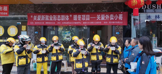 “春风送暖入蜀冬,乡村振兴正当时”我们的脚步不会停滞,接下来我们将继续在佳节为农民工外卖员送上温暖与祝福,积极与社区对接,鼓励签署《外卖快餐自取》倡议书,推动市内“外卖自取点”设立。我们期待更多人关注、理解外卖员的工作,共同努力改善外卖工作环境,保障外卖员合理权益。让我们携手共建和谐、温暖的社会环境,在温情中推动乡村振兴可持续发展!