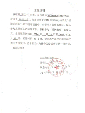 在奉献、友爱、互助、进步的志愿精神感召下,曹孟科同学回到家乡四川省自贡市,在关爱“新就业形态”职工暖冬项目中负责项目策划书撰写、现场参与志愿服务活动等工作,为他人提供帮助、送去温暖与关怀的同时提高了自己的沟通能力与团队协作能力,实现了自我价值,更为社会文明进步做出积极贡献。