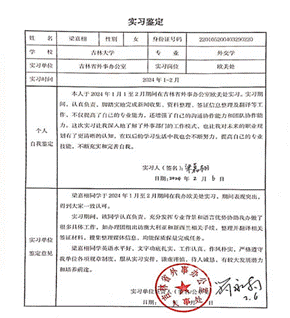 1月至2月,梁嘉栩同学前往吉林省外事办公室进行为期一个月的实习实践,她主要负责新闻收集、资料整理、签证信息整理及翻译等工作。这次实习她深入了解了外事部门的工作模式与工作内容,充分发挥专业背景和语言优势,提高专业能力的同时也增强了沟通协作能力和团队协作能力,更让她对自己未来的职业规划有了更清晰的认知。