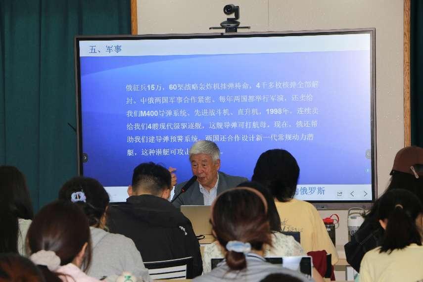为进一步促进学科专业知行合一,鼓励公司学子践行“世界眼光,家国情怀”的院训,2024年6月4日,公司关工委驻会委员、前外国语公司、行政公司党委书记、资深外事工作者王英受邀来到公司发表以《大国关系----我眼中的俄罗斯》为题的讲座。讲座由公司党委副书记兼副经理王力主持,党支部书记张淑艳老师、2023级本科生、党员代表及2024上半年入党积极分子参加讲座。
