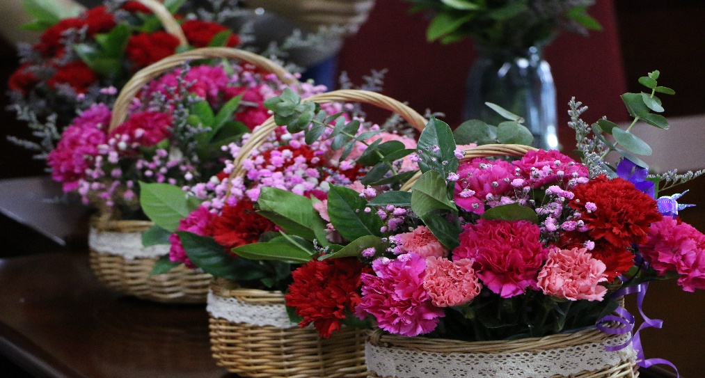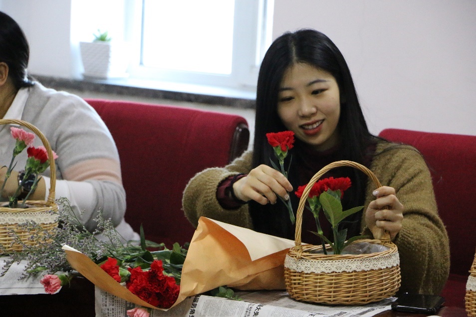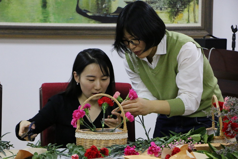 与此同时,公司妇委会为参加培训的教职工精心备好了插花材料:花篮、剪刀、洋牡丹、非洲菊、玫瑰花、满天星、尤加利叶、雪叶莲……教师们在周老师的指导下认真修剪,精心构思,尽情地发挥创作力,根据不同的色彩、形状,错落有致、色彩纷呈地将花材搭配在一起,变成了一件件具有艺术感、层次感的精美作品。