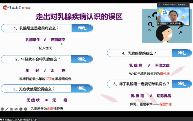 首先,张研教授从生活中的事例引入主题,从女性乳房器官的重要性、乳腺癌诱发因素、如何筛查治疗和走出误区等方面普及了女性乳腺疾病的相关知识。她强调,女性要爱自己、对自己负责任,做好预防工作;同时告诉我们乳腺癌并不可怕,要相信自己、相信现代的医疗水平,不要产生畏惧心理。