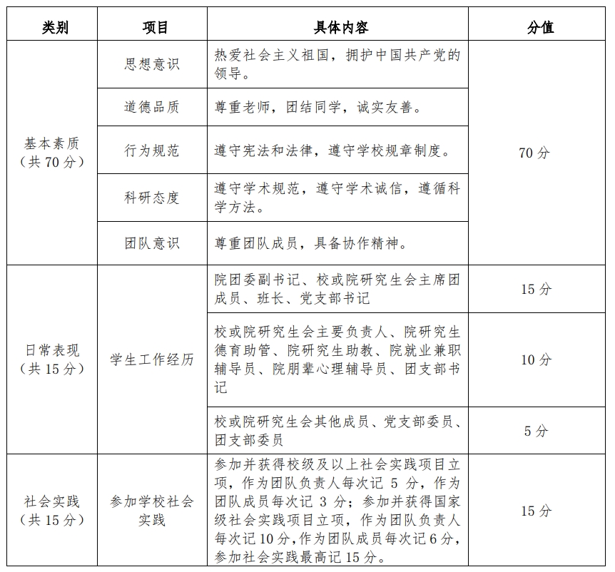 (3) 德育表现包括基本素质、日常表现以及社会实践三个部分。德育表现具体评分办法见附件1。